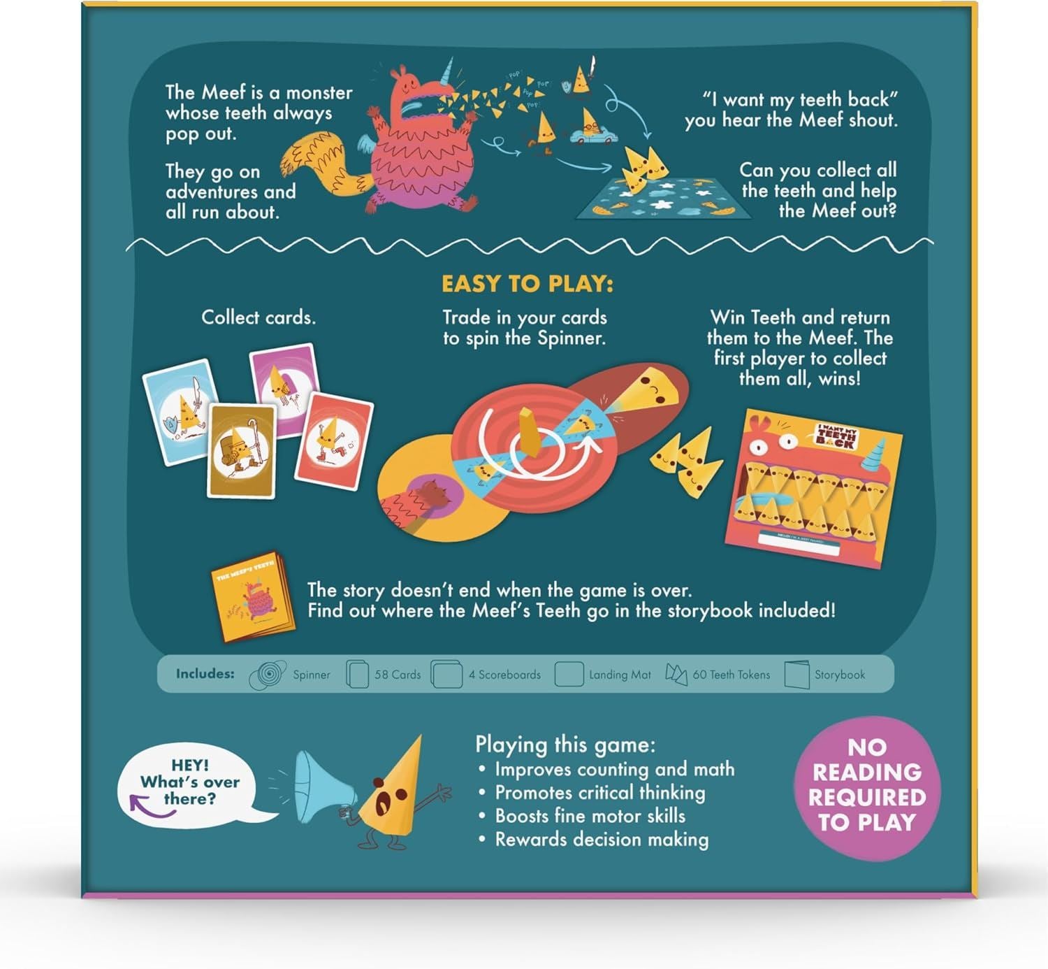 Meef the monster has lost their teeth and needs your help! Collect cards and use the Spinner to get closer to filling Meef’s smile back up. The first one with a full set of teeth wins! With counting practice, fun strategy challenges, and a silly story you can read together, this game is easy for anyone to sink their teeth into. Great for giggle-filled family game nights or one on one bonding time.