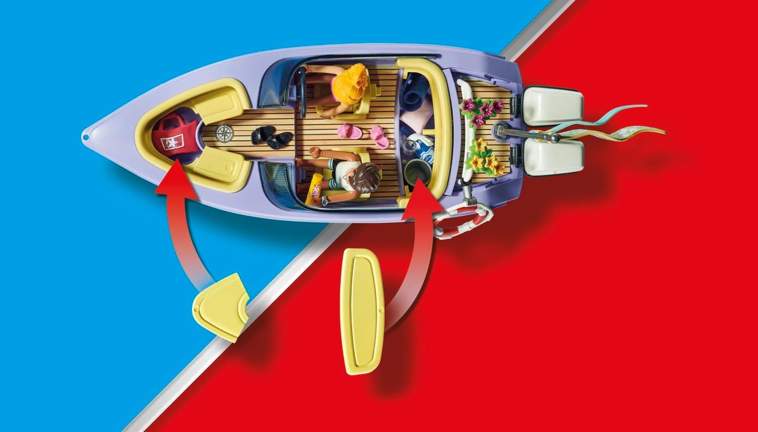 The PLAYMOBIL set Honeymoon Speedboat Trip invites girls and boys aged 4 years and up to a imaginative playtime. The toy set includes two PLAYMOBIL figures, a motorboat, two flags, a bottle and many other great extras. The boat floats and can be upgraded with an underwater motor (sold separately). The two outboard motors can be tilted up separately.